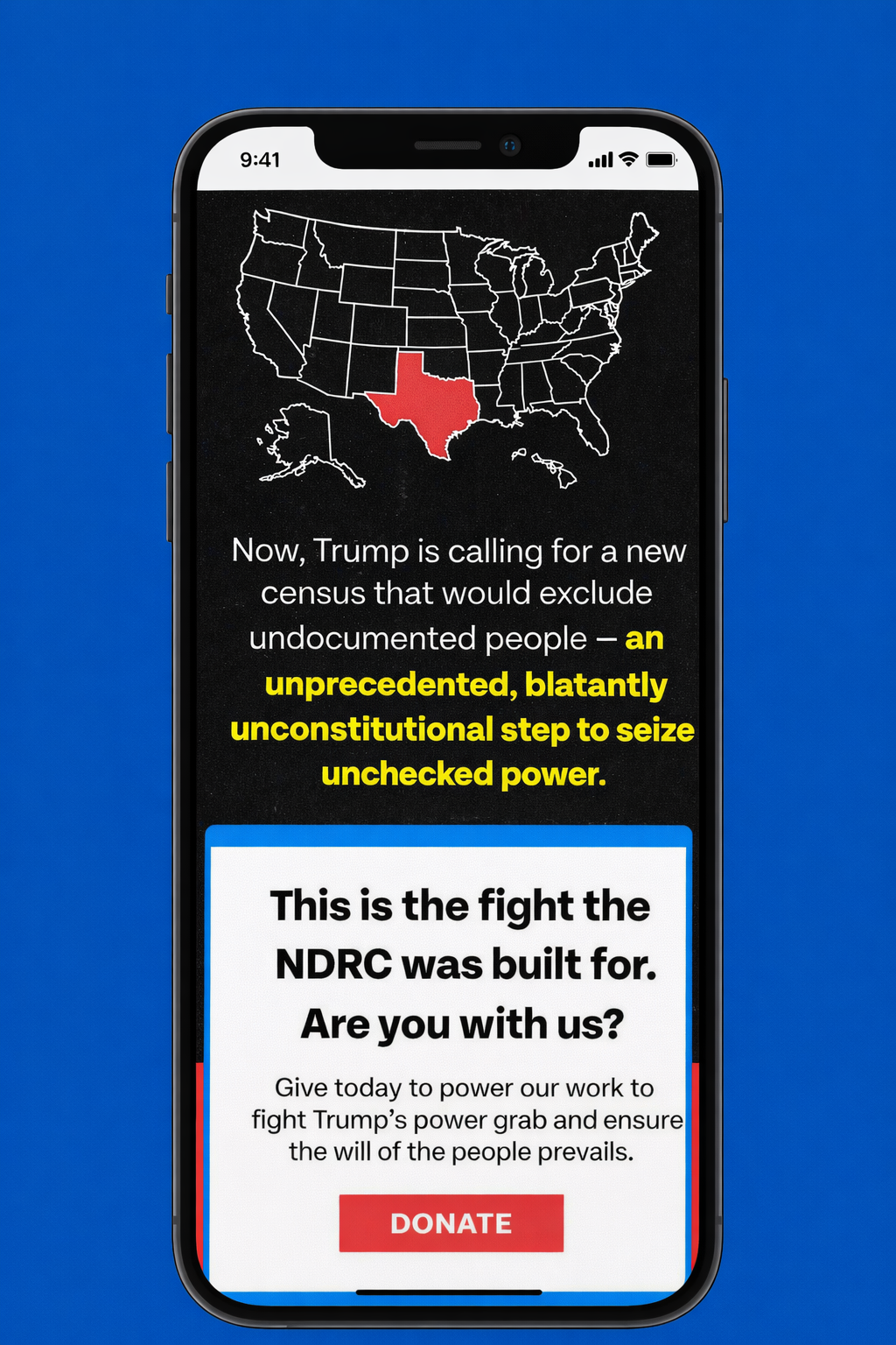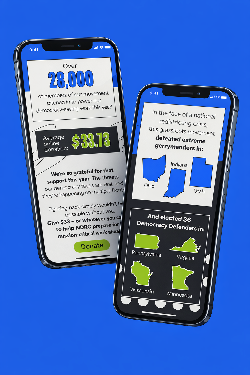 This flagship creative was part of a broader, omnichannel strategy to grow the NDRC’s audience, drive donations, and raise awareness about the existential threat mid-decade gerrymandering poses to democracy. We did all this while also making our creative engaging, energizing, and inspiring.