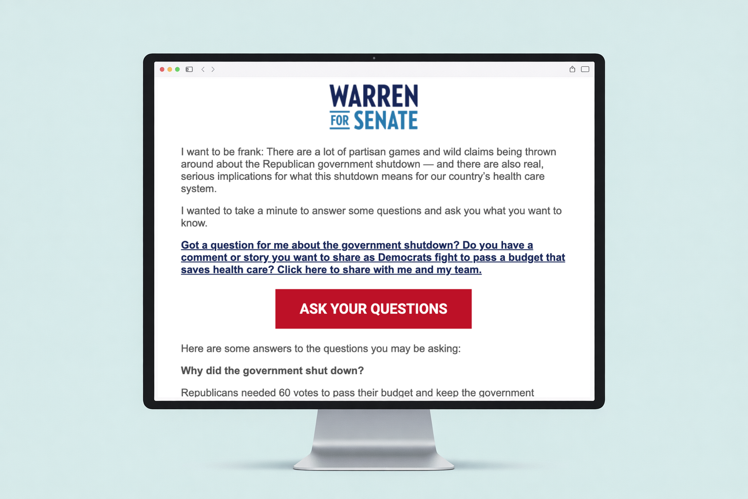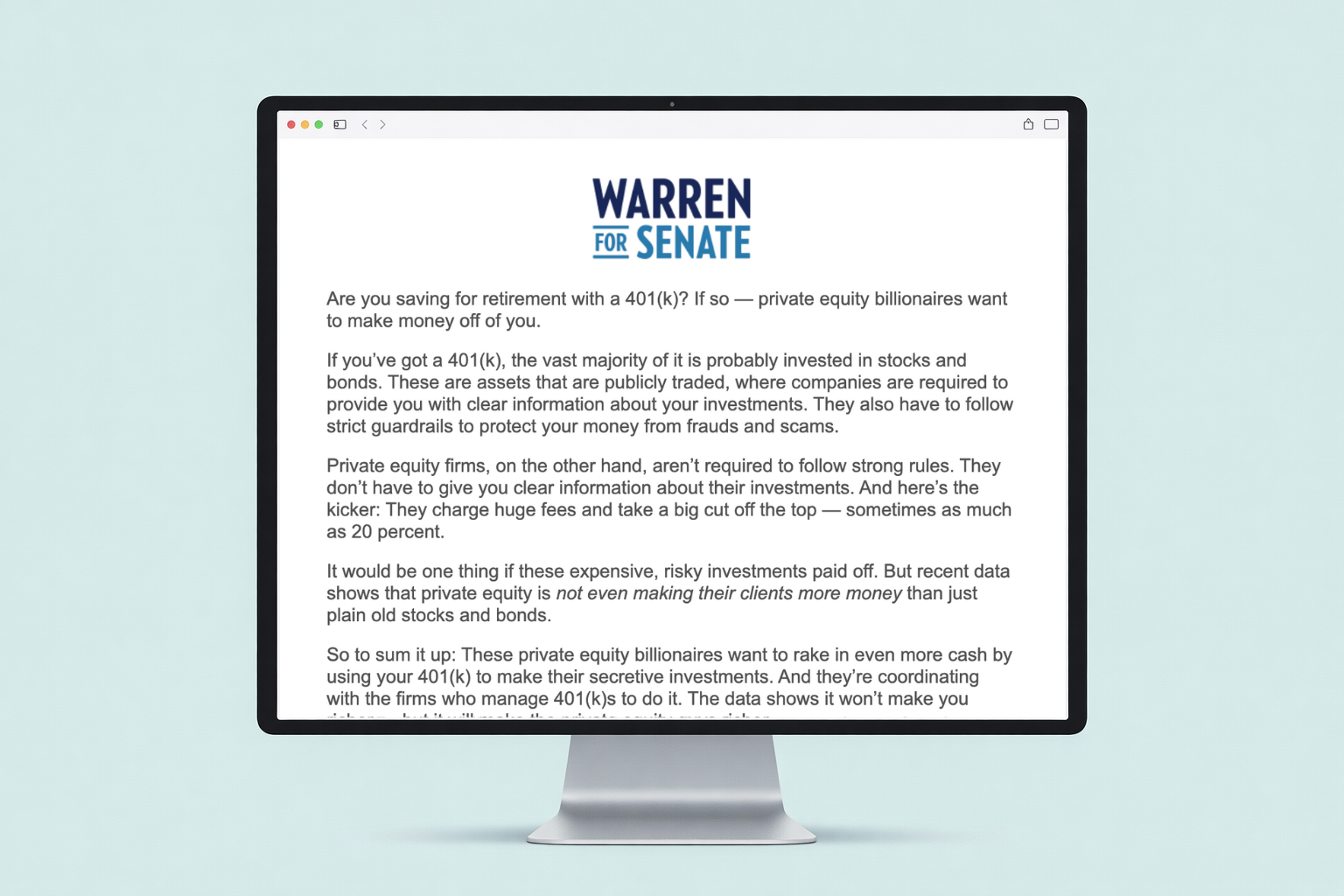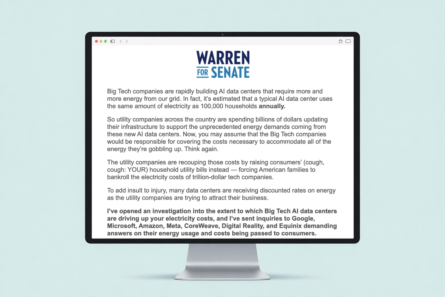 In addition to the government shutdown push, I drafted copy for Senator Warren on policy issues from the wealth gap to AI data centers to private equity—breaking down complex issues into digestible explainers.