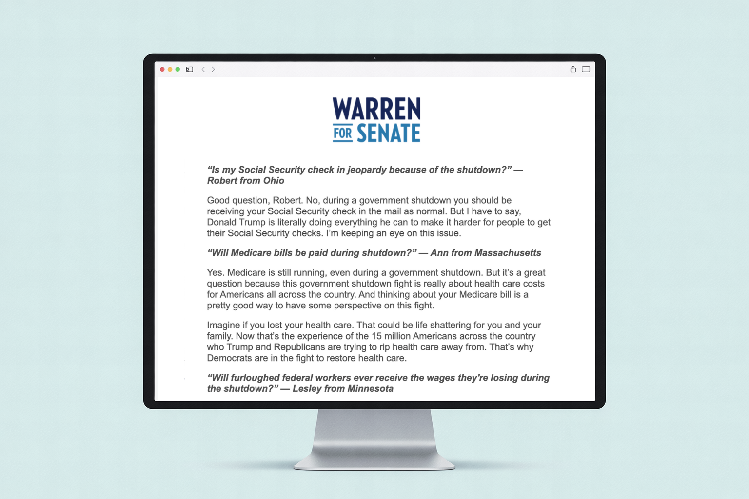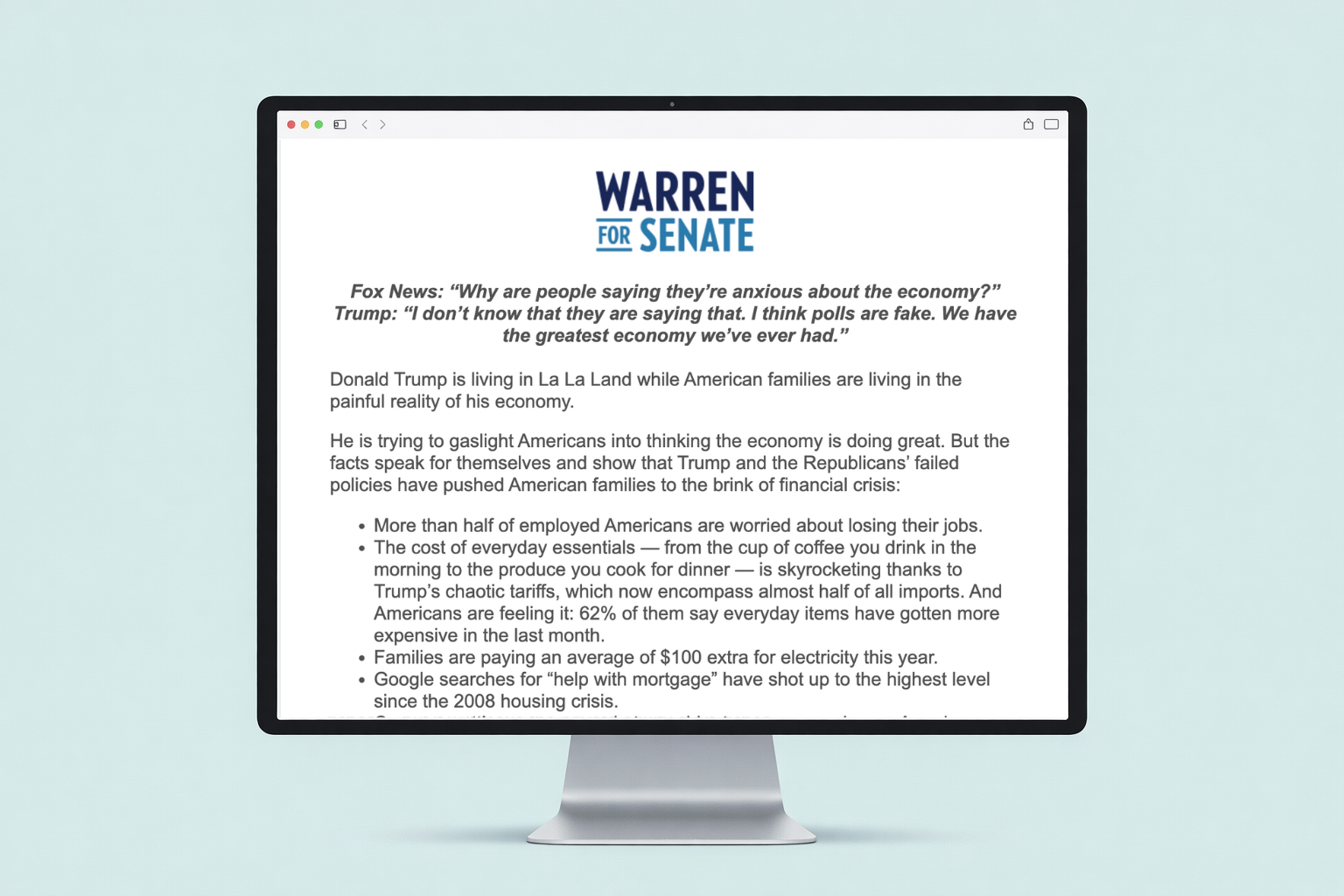 Senator Elizabeth Warren’s team was tasked with crafting a narrative that could break through the slew of misinformation coming from Trump’s White House during his second term. I pitched concepts and wrote copy for Sen. Warren’s email and social media program, providing clarity and inspiration amid all the turbulence.